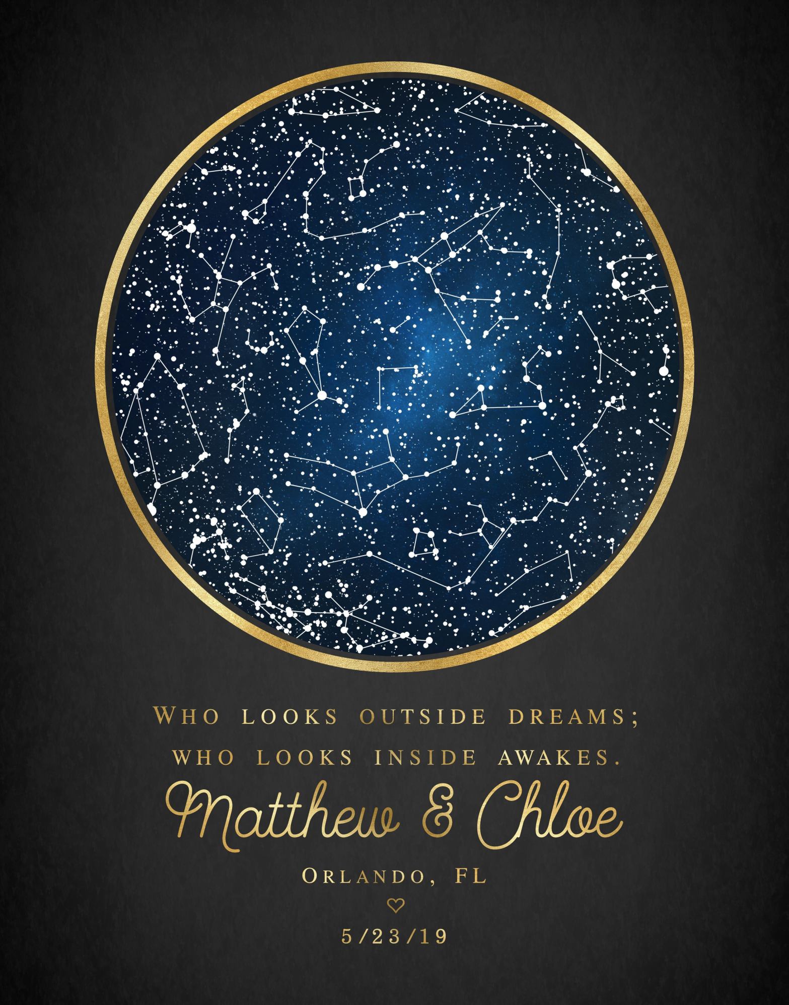 It has been over 1 year with my boyfriend Matthew. To celebrate this anniversary I bought him a custom made star sky monument. This is a special piece because it represents the night sky of when we had our first major date at Disney Springs. The quote is taken from Swiss Psychologist Carl Jung. Which to paraphrase means to understand the world/people around you, you must first understand yourself. The custom art is unique in that it uses any exact date and time to show you the representation of the constellations at the time.