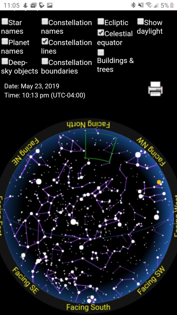 The last thing I wanted to do was to confirm that the night sky on the art piece was an actual representation of the night sky of the date and time I gave them. I was a little skeptical at first because of the right angle constellation lines in the center of the art. I actually found an application that calculates the constellation lines of the sky based on date and time. I entered an Orlando FL zip code, 5/23/19, and 10:13 PM. To my surprise the constellation pattern was exact and I was very pleased. It has been a wonderful year.