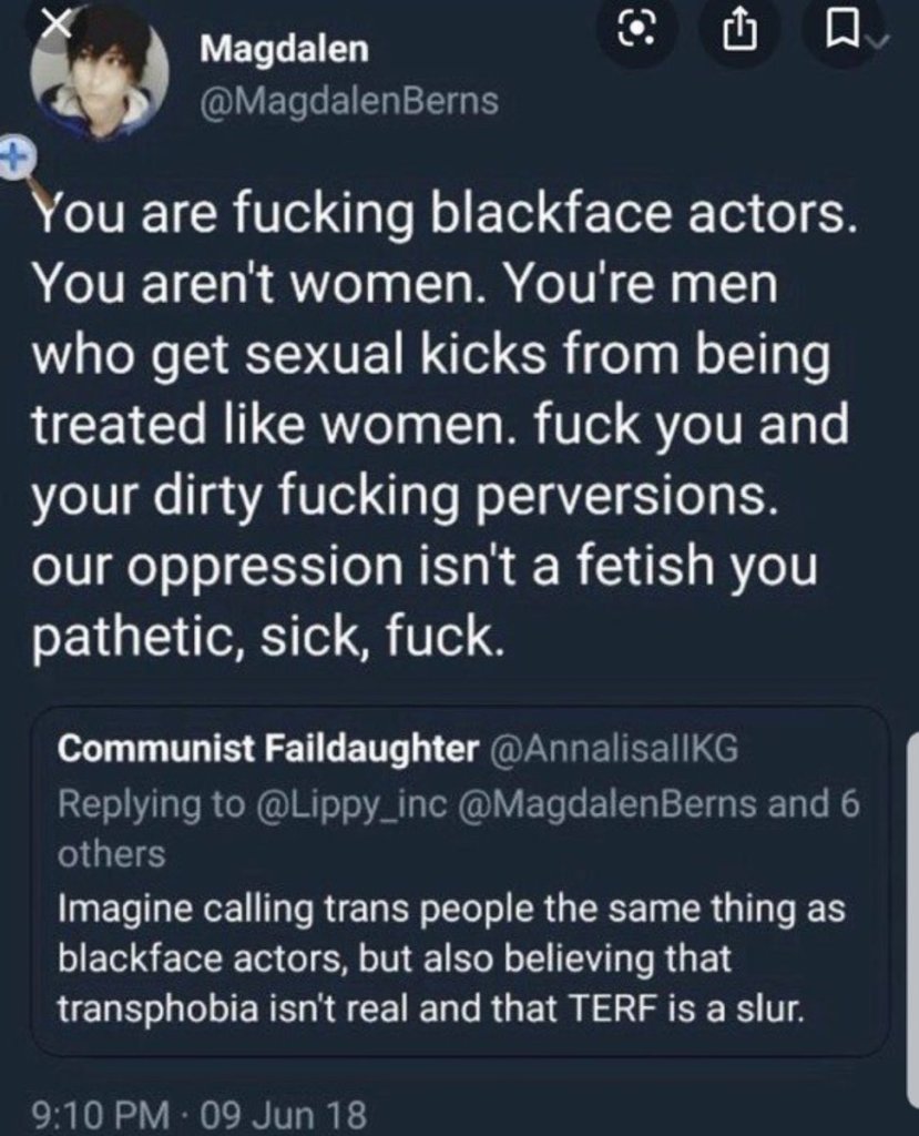 Yes, I agree that I think everyone should have the freedom and choice to date anyone they want. If someone isn’t turned on by dating a transwoman because of what is downstairs, I don’t think that’s bigoted. However, that’s not the problem. Magdalen was not just a feminist, she was a radical feminist and there’s a big difference in that. Magadelen was a transphobic bigot based on numerous other beliefs and thoughts she had of transgender people. I like how Rowling uses the wording “importance of biological sex” here. In reality a more accurate phrasing would be “anti-transgenderism”, but that doesn’t sound as gentle does it? Both the same conclusions, but very different connotations.